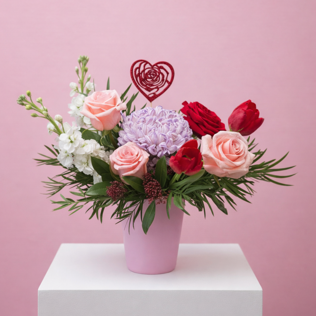 Softly Yours is a delicate Valentine’s arrangement designed to express love in a gentle, heartfelt way. Featuring a beautiful mix of romantic blooms in soft blush, red, and lavender tones, this petite design is perfect for meaningful gestures, sweet surprises, and thoughtful gifting. Artfully arranged in a modern keepsake container and finished with lush greenery and a charming heart accent, Softly Yours is proof that love doesn’t have to be loud to be unforgettable.
