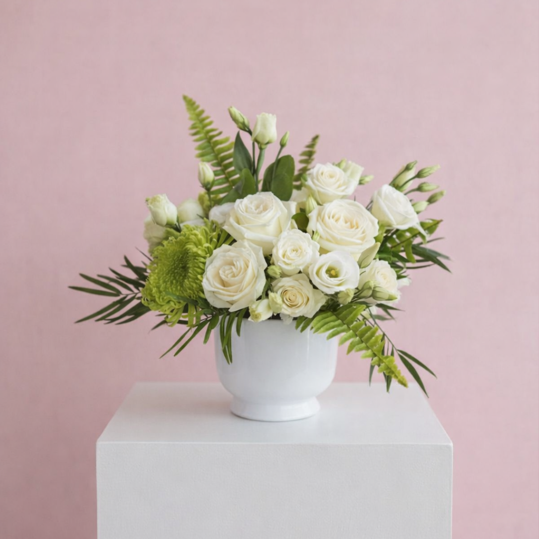 Classic, serene, and effortlessly elegant, Ivory Poise is a refined arrangement of soft ivory blooms accented with fresh, vibrant greenery. Featuring creamy white roses, delicate buds, and lush fern textures, this design exudes calm sophistication and timeless beauty. Styled in a smooth white ceramic vase, it’s a graceful choice that complements any space with understated charm.