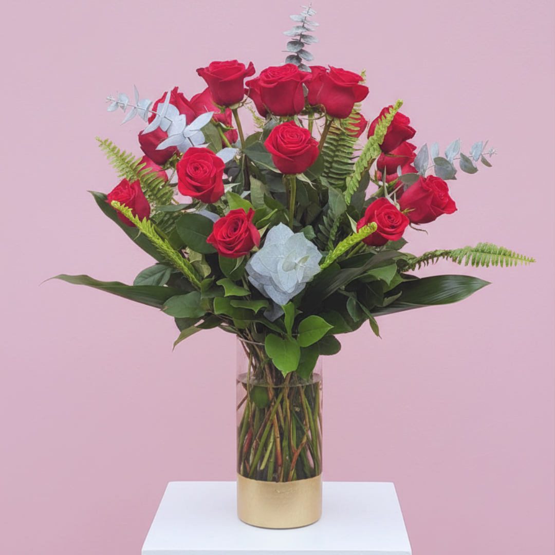 Bold, passionate, and undeniably striking, Red Desire features 30 premium red Rosa Prima roses, celebrated for their large blooms, rich color, and exceptional quality. Arranged with lush greenery including eucalyptus and fern accents, this design delivers dramatic height, texture, and timeless romance. Styled in a clear glass vase with a modern gold base, it’s a powerful expression of love and admiration—perfect for moments that deserve to be unforgettable.