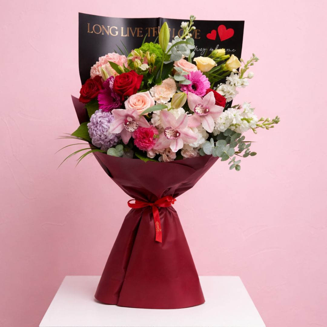 The Signature Love Bouquet is a designer’s choice arrangement, meaning each bouquet will vary slightly in color placement and flower positioning. However: Bloom varieties will remain consistent Colors will stay within a classic Valentine’s palette of red, white, pink, purple, and green Your bouquet will always reflect the romantic style, fullness, and quality shown This allows our designers creative freedom while ensuring your bouquet stays true to the Valentine’s aesthetic you expect. Perfect for expressing love, admiration, and heartfelt emotion. Let our designers create a beautiful floral story—crafted with care, intention, and love.