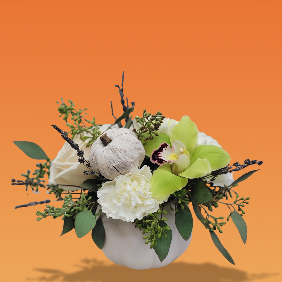 Our Cinderella Jr. brings the magic of fall into a petite yet elegant design. Styled in a charming white ceramic pumpkin, this arrangement features soft white roses, fresh carnations, and a striking green cymbidium orchid. Accented with natural greenery and a decorative white pumpkin, it’s the perfect balance of seasonal charm and refined beauty. Ideal for side tables, desks, or as a thoughtful gift, Cinderella Jr. proves that even smaller arrangements can make a big impression.