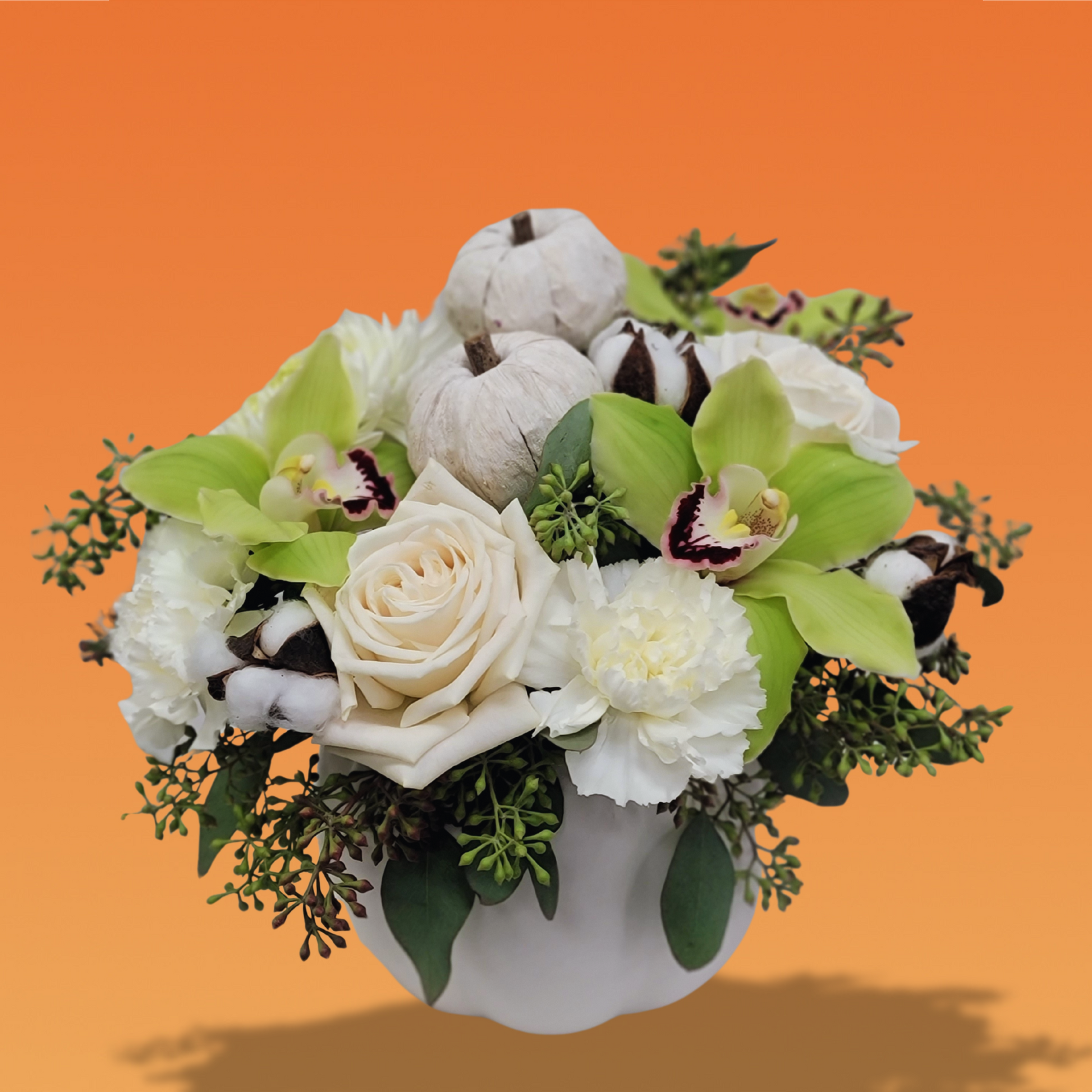 Step into timeless elegance with our Cinderella arrangement, a graceful design that transforms the season into something magical. Set in a chic white ceramic pumpkin container, this bouquet features pure white roses paired with striking green cymbidium orchids. Accented with lush greenery, Cinderella blends autumn’s charm with refined beauty, making it an enchanting centerpiece or a luxurious gift for someone special.