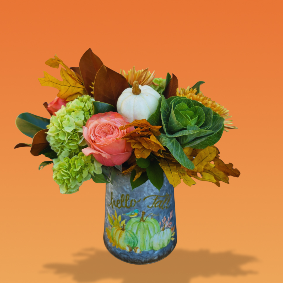Welcome the cozy season with our Hello Fall floral arrangement , a charming mix of autumn’s warm hues and fresh seasonal blooms. Featuring lush hydrangeas, vibrant garden roses, golden mums, and ornamental cabbage, this design is topped with a festive white pumpkin for the perfect seasonal touch. Arranged in a rustic tin vase with hand-painted pumpkins and the cheerful greeting “Hello Fall,” this arrangement makes a wonderful centerpiece for your table or a thoughtful gift to celebrate the season.