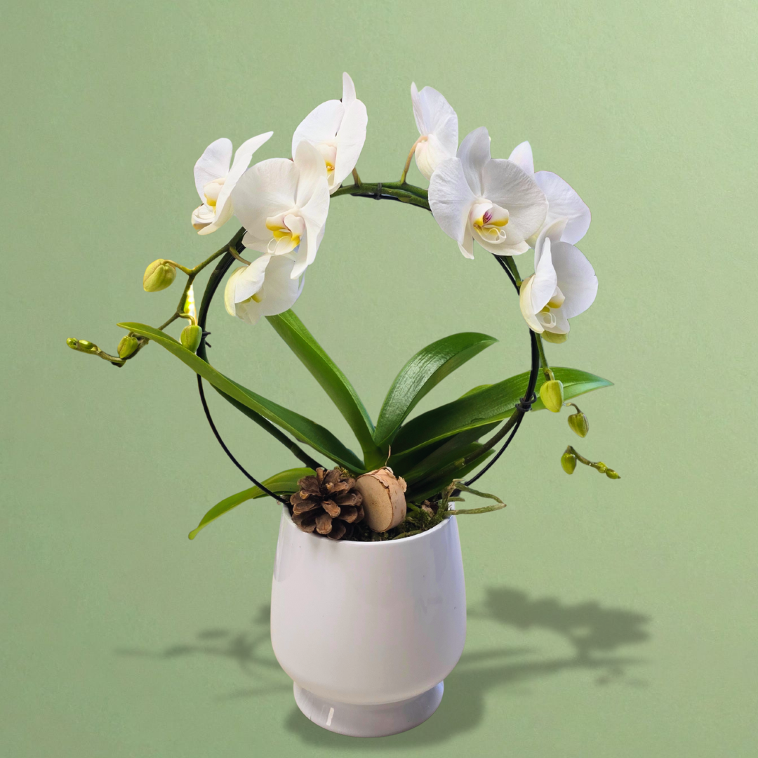 Elevate any space with Infinite Grace, a beautifully sculpted phalaenopsis orchid trained into an elegant infinity loop. This modern, minimalist design symbolizes never-ending beauty and effortless sophistication, making it the perfect gift or décor piece for the holiday season and beyond. Crisp white blooms cascade gently along the circular frame, creating a serene, sculptural silhouette. Set in a sleek white ceramic planter and accented with natural woodland touches, this design balances simplicity with refined artistry. Whether displayed on a desk, console, or dining table, Infinite Grace brings a calming, timeless presence to any environment.