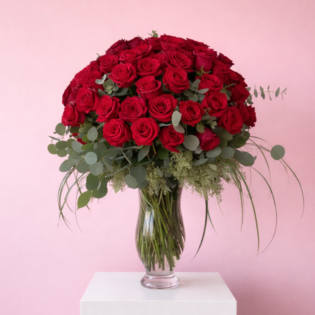 Bold, romantic, and undeniably striking, Love Without Limits is a breathtaking arrangement of 50 premium red roses, designed to make an unforgettable impression. Each rose is carefully selected for its rich color, full bloom, and timeless beauty, then artfully arranged to create a lush, dramatic presentation. Finished with luxurious wrapping, this bouquet is the ultimate expression of passion, devotion, and grand romantic gesture. Perfect for moments that call for something extraordinary, Love Without Limits transforms love into a powerful statement—elegant, confident, and impossible to overlook.