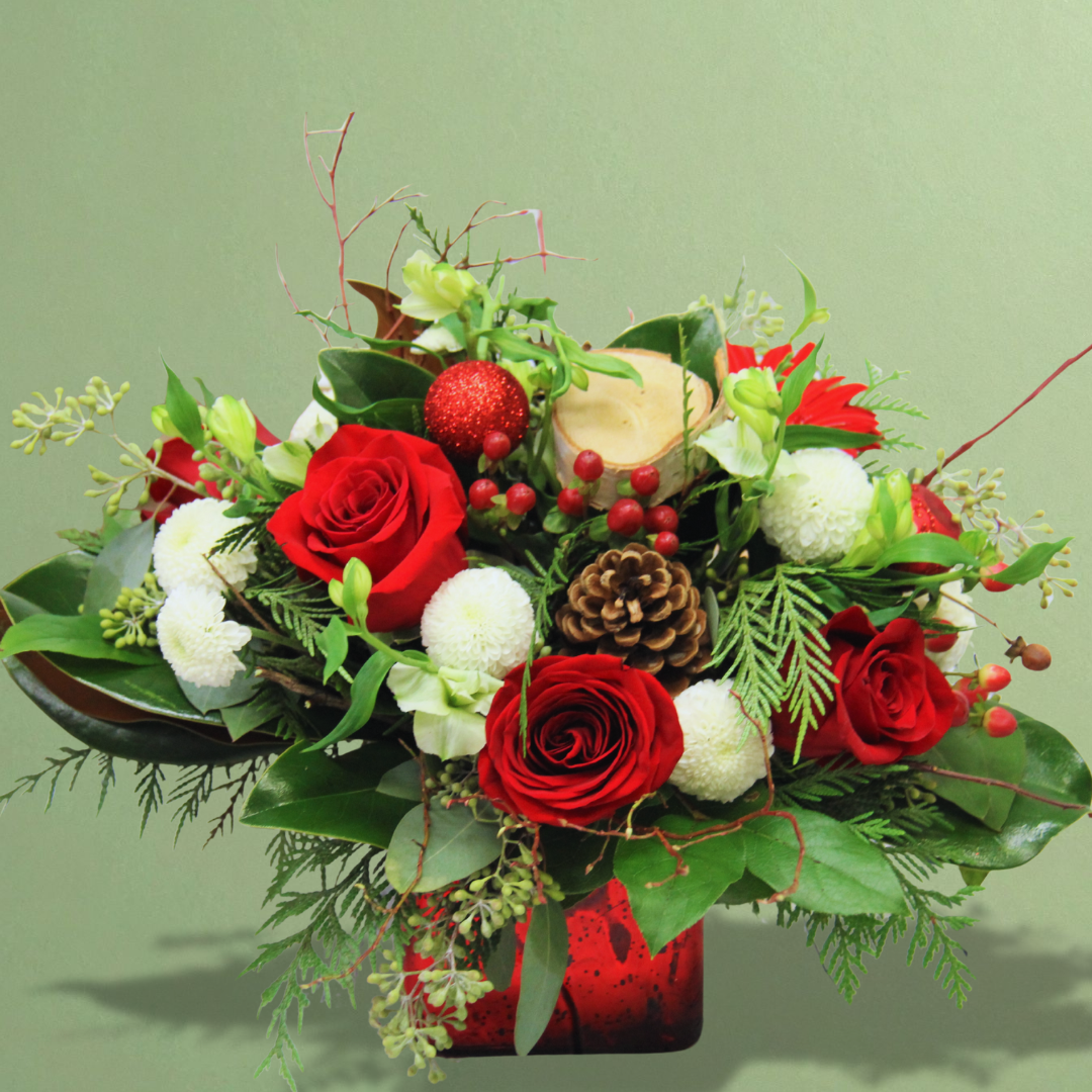 Bring the magic of Christmas to life with Santa’s Little Helper — a cheerful mix of red roses, white mums, holiday greens, and festive accents. Nestled in a shimmering red vase, this playful arrangement captures the joy and sparkle of the season. Whether it’s brightening your holiday table or spreading cheer to someone special, this design delivers a merry dose of Christmas spirit.