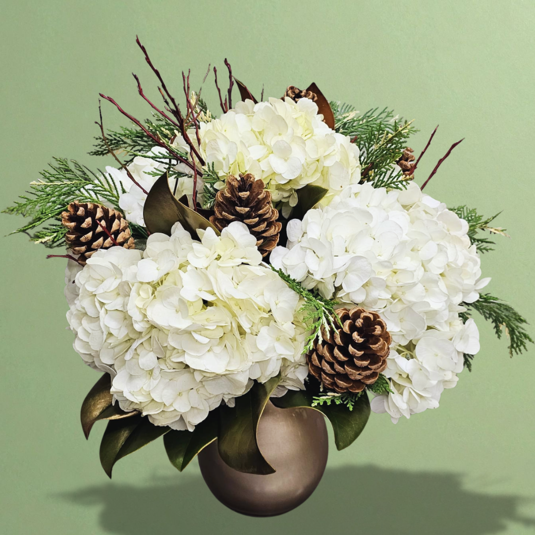 Celebrate the beauty of the season with Nature’s Simplicity, a graceful blend of all-white hydrangeas, fresh evergreens, and natural pine cones, gathered in a luxurious gold vase. This elegant arrangement captures the essence of a white Christmas — crisp, timeless, and full of warmth. The lush evergreens add depth and texture, while the pine cones bring a cozy, woodland charm. Paired with the golden vessel’s radiant glow, Nature’s Simplicity offers a perfect balance of natural beauty and holiday sophistication. Ideal as a centerpiece for festive gatherings or as a heartfelt seasonal gift, it embodies the serene elegance of Christmas at its finest.