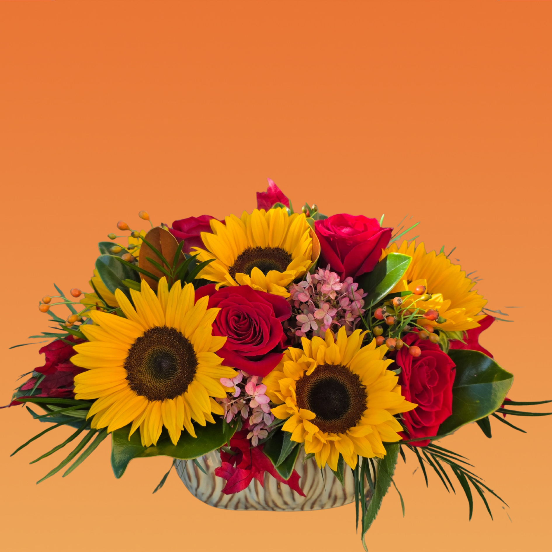 Brighten any room with the warmth of our Sunny Harvest fresh arrangement. This cheerful bouquet features golden sunflowers, radiant red roses, soft pink blooms, and accents of seasonal greenery and berries. Designed in a stylish woven ceramic , this arrangement captures the beauty of fall with a fresh, uplifting twist. Whether as a centerpiece for your table or a heartfelt gift, it brings sunshine and joy to any occasion.