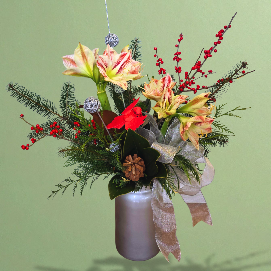Radiating holiday elegance, Winter’s Grace captures the refined beauty of the season. Designed in a tall silver vase, this arrangement features striking amaryllis blooms — available in shades of candy cane, red, or white, depending on seasonal availability— surrounded by lush evergreens and vibrant ilex berries. A charming cardinal perched among the branches adds a whimsical touch and a joyful nod to the magic of winter. The combination of bold florals, rich greenery, and shimmering silver creates a captivating centerpiece that embodies both sophistication and festive warmth.